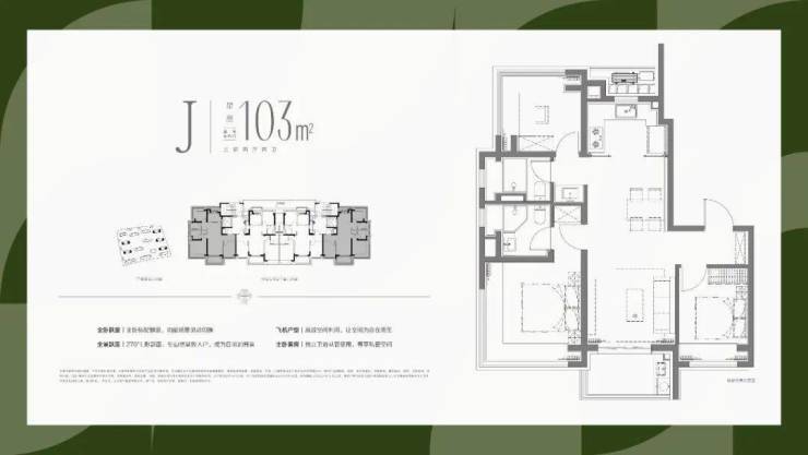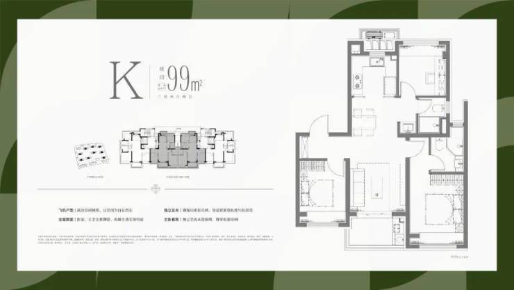 实现了大面宽横厅的飞机户型设计,使得南向的开间,全部布置为客厅△▲、主卧和次卧三个最重要的功能区;北向房间则布置了次要的厨房■•▷、次卫▷-、书房和主卫功能,最优化的提供南向面宽和缩窄户型整体进深,提升户型整体的采光和通风。