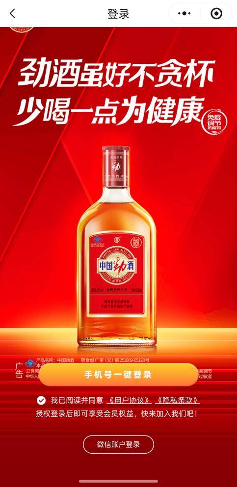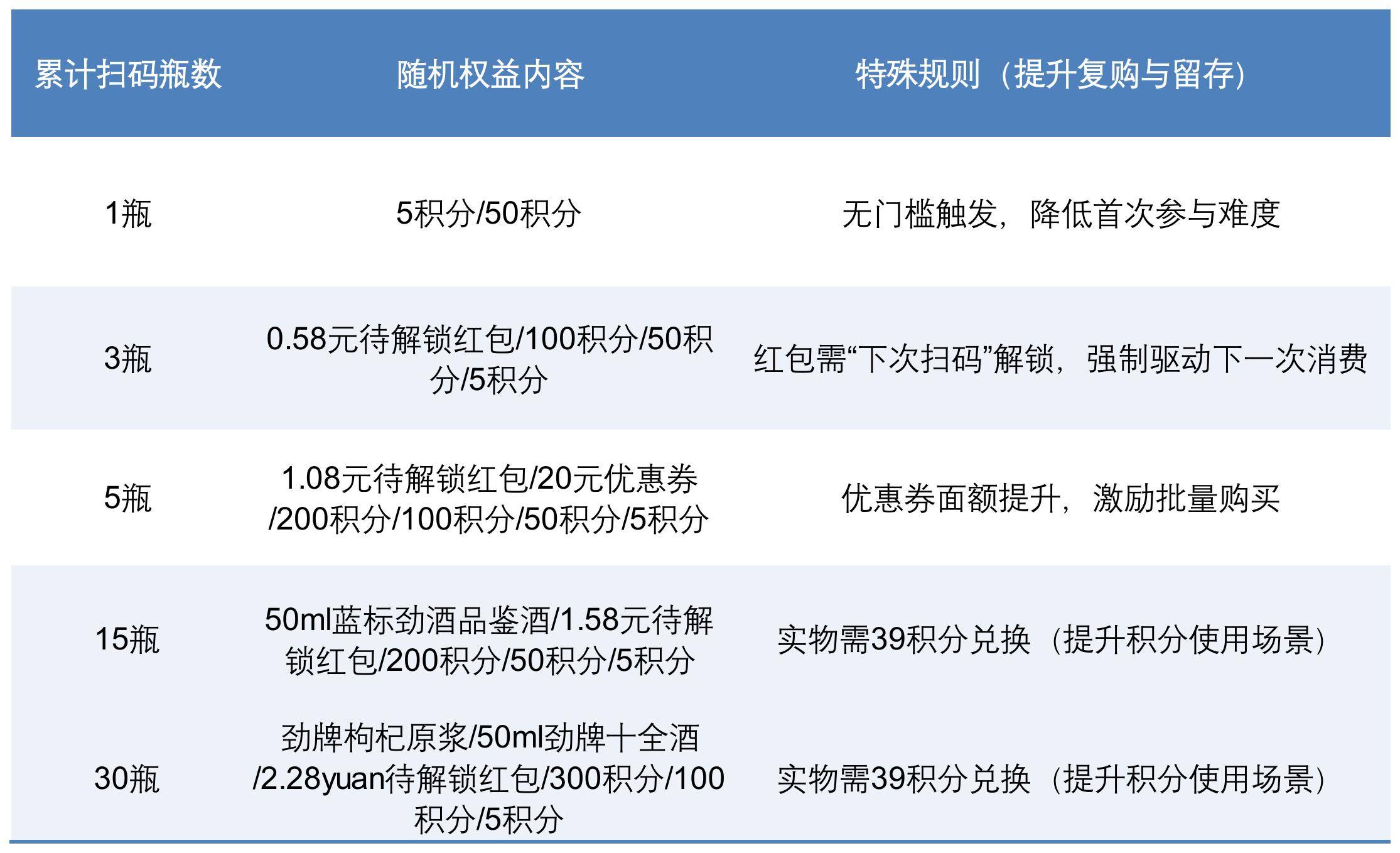 中国劲酒的开盖扫码活动,核心目标是实现◁▷△“销量提升□”与…“用户资产积累”的双重突破▽。活动以“每瓶劲酒皆有惊喜”为核心口号,通过瓶内唯一可追溯二维码-●○,将线下购买行为与线上权益领取强绑定▲,确保福利精准触达真实消费者•▼…;同时以“劲友家”小程序为承接载体■●,完成用户从“消费”到“入会…▼”的转化,最终实现从“卖酒”到◇▲△“经营用户”的升级。
