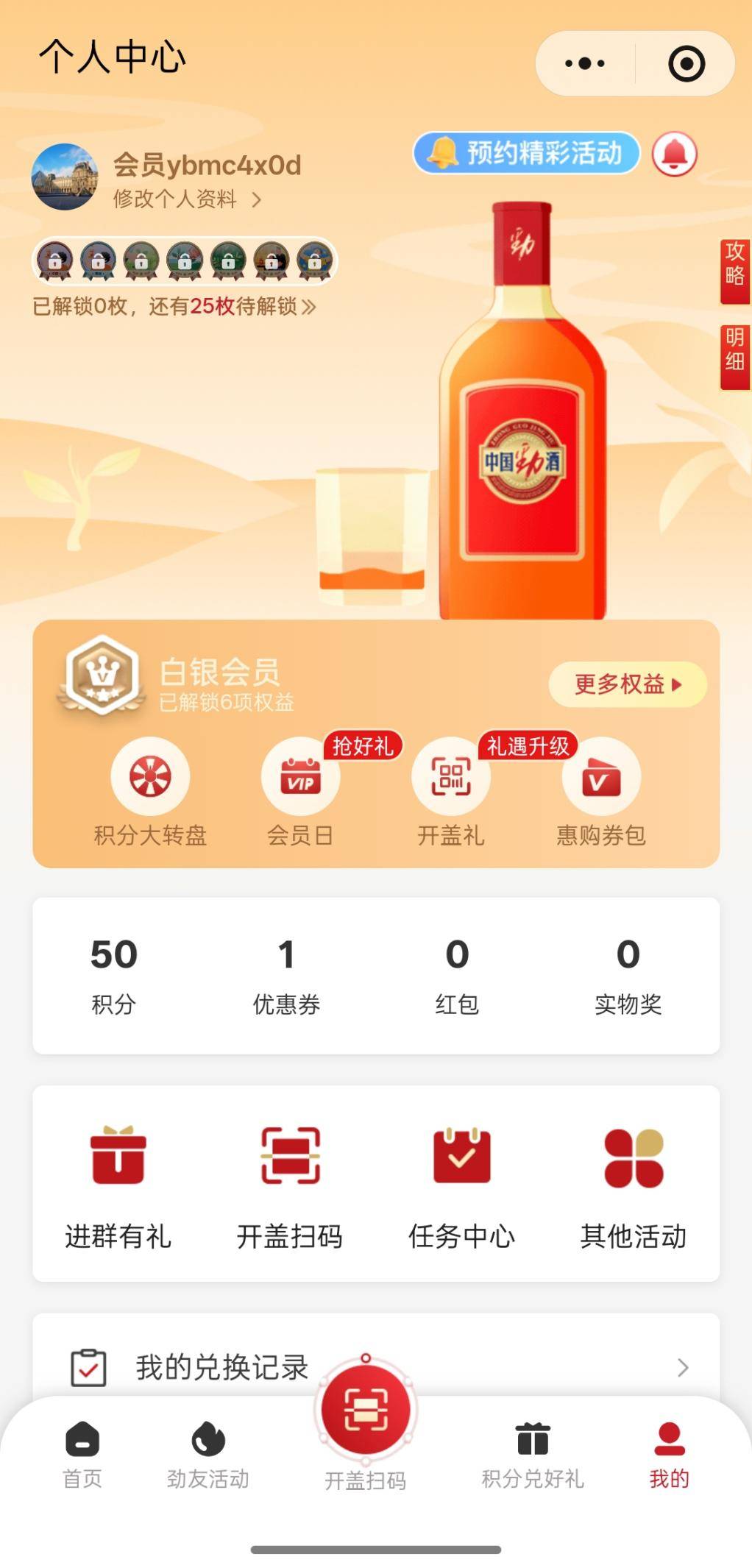 2.权益使用限制:积分不可转卖▷、不可兑现,仅用于小程序内兑换商品或参与活动;优惠券限指定劲酒产品使用,有效期30天,逾期自动失效■■•;现金红包需绑定实名微信账号方可领取,未实名用户无法提现。