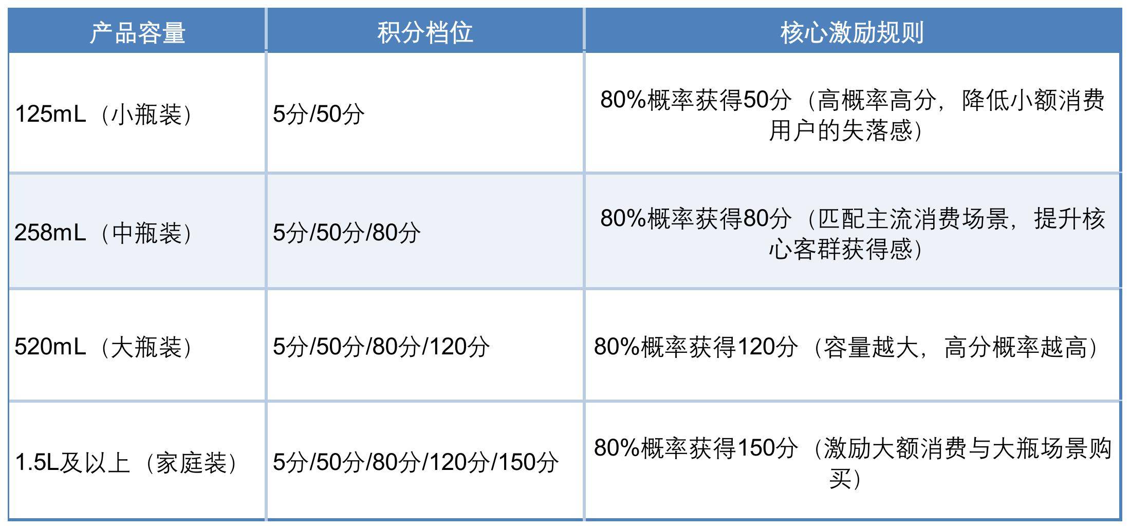 核心形式为“开盖积分◁”,按产品容量设置差异化积分档位▼□,同时加入△“高概率高分”机制提升惊喜感,确保不同消费能力的用户都能获得正向反馈△=□: