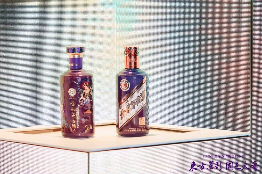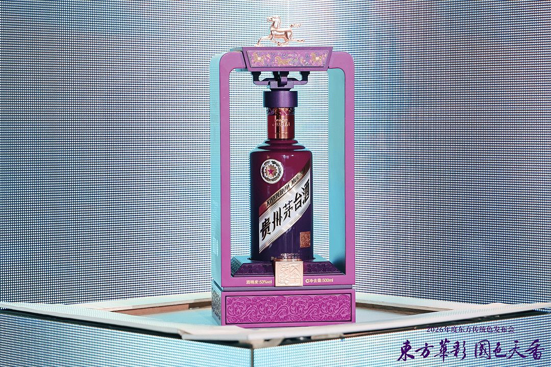 以年度东方传统色=“齐紫”作为主色调的贵州茅台(丙午马年)生肖系列产品,完整保留了生肖酒前作中五行、生肖、书画艺术等核心元素,同时又创新性地融入传统名瓷、非遗工艺等多元文化符号。