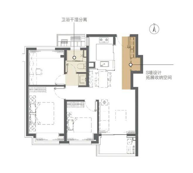 实现了大面宽横厅的飞机户型设计◆•,使得南向的开间,全部布置为客厅□▽…、主卧和次卧三个最重要的功能区;北向房间则布置了次要的厨房、次卫、书房和主卫功能,最优化的提供南向面宽和缩窄户型整体进深■,提升户型整体的采光和通风。