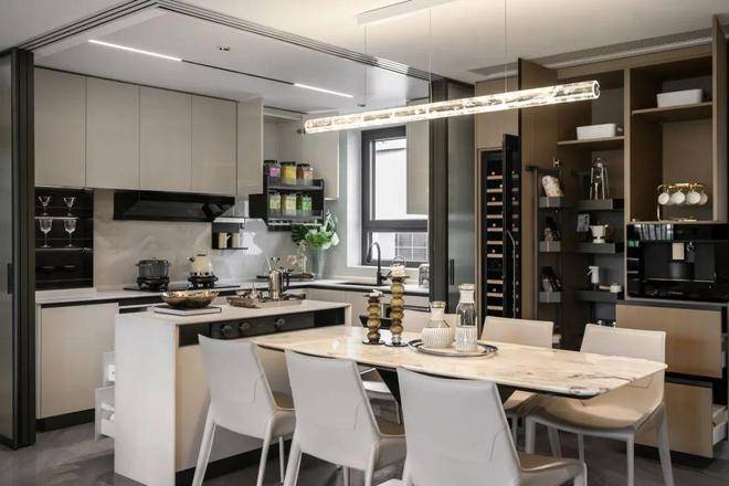 招商时代乐章艺术化的再造传统餐厨空间,可开可合的岛台设计,结合艺术玻璃移门,在提升空间灵动性的同时◇▷•,也激发出餐厨空间生活的多样性▽。