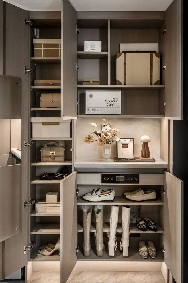 玄关柜设置消毒精灵,在保持健康居家环境的同时,也让生活的情绪感满满▼…。长靴隔板方便长靴的护理与收纳。换季鞋盒收纳区,进一步提升收纳空间。