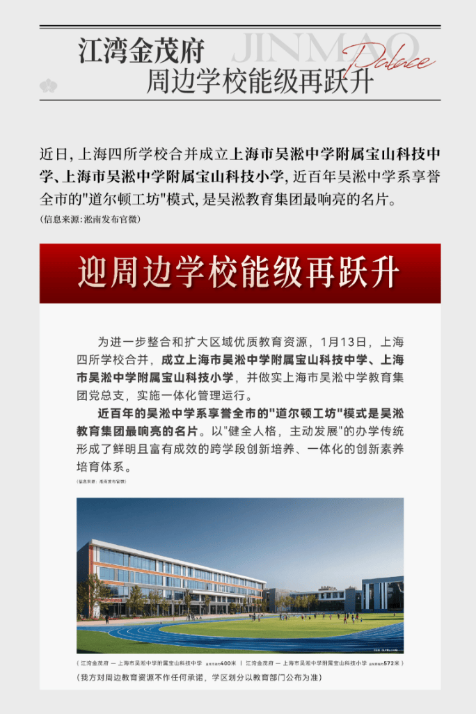 4、优质教育集群,是价值最深厚的“压舱石” 当板块内的教育资源通过战略合并与整合实现能级跃升,其带来的不仅是教育选择的优化,更是区域价值的深层加固。优质学校的聚集,始终是资产穿越周期最坚实的保障,为社区提供着持续而稳定的内生动力。上海四所学校合并成上海市吴淞中学附属宝山科技中学、上海市吴淞中学附属宝山科技小学两所重点学校,这将为江湾金茂府的未来价值提供重要支撑。