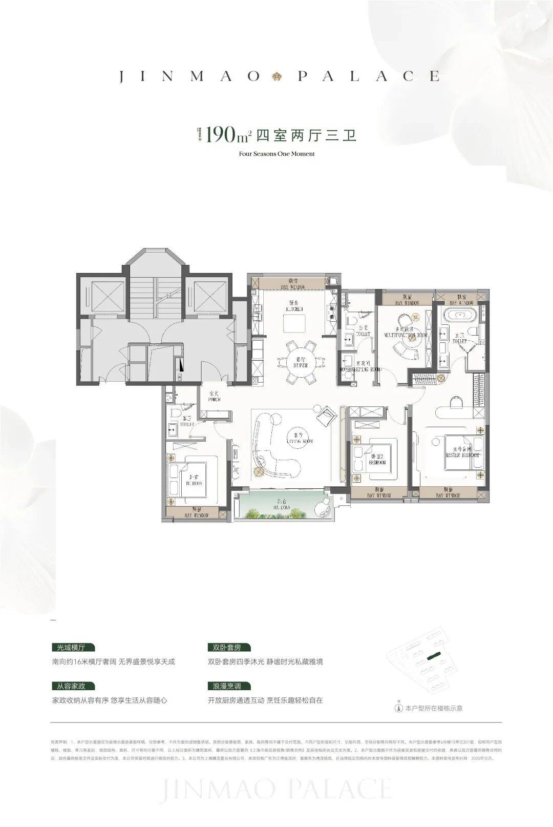 ● 建面约190㎡4房:楼王位置的顶奢大平层,同价位段在杨浦只能买到约120㎡3房!